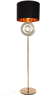 W kolekcji MONTERONI charakterystyczne są kontrasty - minimalizmu połączonego z ciekawym wzornictwem detali oraz kolorystyczne - gdzie łączy się elegancka, głęboka czerń ze złotymi elementami metalowej konstrukcji. Czarny abażur wykonany został z solidnej, nieprzepuszczającej światła tkaniny. Jego szczególną cechą jest złote wnętrze - błyszcząca powłoka nadająca lampie stojącej szczególnego charakteru. Do ciepłego, złotego odcienia wnętrza abażura dopasowany został kolor całego stelaża lampy wraz z jego centralnie występującą ozdobą. O ile konstrukcja lampy podłogowej jest prosta i niewyszukana - stanowią ją okrągła, płaska podstawa oraz prosty drążek, będący bazą dla wszystkich elementów prezentowanego oświetlenia, o tyle dekoracja stanowi bardzo mocny i wymyślny detal, obok którego nie można przejść obojętnie. Jego hipnotyzujące, ułożone w jedną całość obręcze w genialny sposób zdobią i wyróżniają lampę spośród innych modeli lamp stojących.