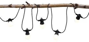 Siedmioczęściowy łańcuch oświetlenia zewnętrznego Plug & Shine do oświetlenia dekoracyjnego Na tarasach, w ogrodach frontowych, na altanach i drzewach można za pomocą tego łańcucha świetlnego uzyskać nastrojową dekorację świetlną. Wyposażony jest w siedem matowych żarówek, w których umieszczone są diody LED zainstalowane na stałe. Kabel i obudowa są czarne. Łańcuch świetlny może być elastycznie umieszczony na zewnątrz, do czego służą przedłużacze (patrz akcesoria).