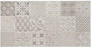 To mix płytki matowej i błyszczącej, jako zamierzony efekt dozdobienia cementowego charakteru płytki. Szare, przecierane tło zostało wzbogacone patchworkowym charakterem struktury - to nienachalna dekoracja, która nie znudzi oka przez lata.