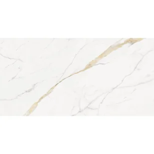 Gres szkliwiony rektyfikowany Medina Gold imitujący kamień. Klasyczny biały marmur z delikatną złotą żyłą. Format 60 x 120 cm.