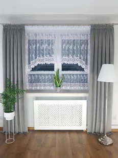 Elegancka Firana do kuchni z zazdrostkami oraz oryginalną gipiurą Nasz model - firanka do kuchni w kształcie m-ki wykonana z markizety typu siateczka, to ide...