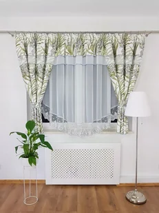 KRÓTKA FIRANKA GOTOWA Z ZASŁONAMI I HAFTEM ZIELONE MONSTERY FIRANKI DO KUCHNI SALONU SYPIALNI WOAL NA TAŚMIE Firana gotowa z woalu w odwrócony łuk z zasłonka...