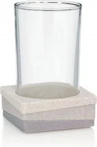 Kubek z podstawką w kolorze beżowym, wykonany z tworzywa POLI i szkła.