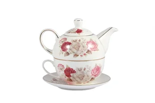 Bardzo oryginalny komplet z porcelany składający się z dzbanka, filiżanki z talerzykiem oraz sitka. Zestaw ozdobiony motywem róż. Całość zapakowana w pudełko...