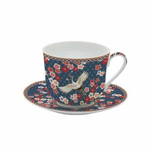 Duża porcelanowa filiżanka deserow-śniadaniowa - Chinoserie - Strawberry Thief, wraz ze spodkiem Roślinno-kwiatowy wzór z ptakami, znany jako Strawberry Thief, pochodzi ze staroabielskiej tapety z manufaktury William Morris , inspirowanej estetyką Dalekiego Wschodu. Artykuł znajduje się w ładnym pudełku z tym samym wzorem.