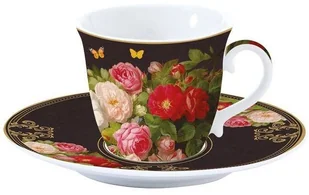 Porcelanowa filiżanka do herbaty lub kawy, ze spodkiem - Victorian Garden Porcelana ozdobiona jest motywem pięknych kwiatów i motyli na brązowym tle. Artykuł znajduje się w eleganckim pudełku z tym samym motywem. Średnica filiżanki: 8,2 cm (góra) Wysokość filiżanki: 7,2 cm cm Średnica spodka: