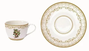 Porcelanowa filiżanka ze spodkiem, z kolekcji CHRISTMAS HOLLY , ozdobiona motywem ostrokrzewu oraz wzorem w kolorze złotym. Artykuł znajduje się w eleganckim, prezentowym pudełku z tym samym motywem. Pojemność filiżanki: 240 ml Średnica filiżanki: cm, wysokość: