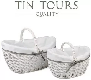 19 cm wysokość kosza bez pałąka w najniższym punkcie: 15 cm Cechy produktu: komplet składa się z 2 koszy różnej wielkości; wykonany z naturalnego materiału: wikliny; rękodzieło; wiklina barwiona: odcienie bieli; środek wyłożony materiałem obszytym dekoracyjną lamówką; wyszycie zdejmowane - w razie zabrudzenia można je wyjąć i wyczyścić; solidny i poręczny uchwyt; pojemny.