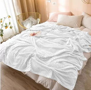 Miły i przyjemny w dotyku pled w prążki w kolorze białymi idealny jako koc i jako narzuta na łóżko.