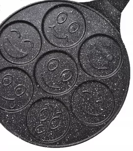CZARNA PATELNIA DO NALEŚNIKÓW ZE WZORKAMI BUZIEK i EMOTEK ---------------------------------------- warianty z rączką czerwoną i brązową skończyły się. Uwaga - Patelnia z aktualnej dostawy nie obsługuje INDUKCJI ( tytuł aukcji jest BŁĘDNY --------------------------------------- Patelnia równomiernie i szybko się nagrzewa dzięki czemu każdy naleśnik będzie idealnie przygotowany. Dzięki nieprzywierającej powłoce, która zapobiega przypalaniu przypraw możesz wykorzystać patelnie do przygotowania jajek sadzonych krewetek bekonu papryki pancake mięsa polędwicy oraz innych rodzajów mięs produkt zapobiegający przypalaniu się i przywieraniu potraw Patelnia wykonana jest z aluminium i stali nierdzewnej Powłoka patelni nie przywiera potrawy Obecnie patelnia jest tylko w kolorze czarnym Wysoka odporność na zarysowania i wysoką temperaturę W ZESTAWIE patelnia rączka Wymiar jednego placuszka: 6,5 cm Średnica patelni: 26 cm W ZESTAWIE patelnia rączka ------------------------------ WAŻNE można używać na kuchenkach gazowych, elektrycznych, ceramicznych