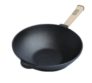 Żeliwna patelnia wok, 25 cmPatelnia jest wykonana z żeliwaRączka wykonana z drewnaŚrednica: 25 cmWysokość: 7 cmNadaje się do wszystkich płyt grzewczych: Gazowa, ceramiczna, indukcyjna, elektryczna
