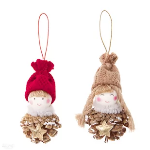 Wyjątkowe zawieszki z dziewczynką i chłopcem, sprawdzą się doskonale jako ozdoby choinkowe lub dodatkowe elementy do większych projektów np. świątecznych wieńców, stroików lub girland. Doskonałe również jako drobny upominek lub element dekoracyjny do opakowań i toreb prezentowych. Podstawą zawieszek są delikatnie zdobione białą farbą i złotymi gwiazdkami szyszki. Laleczki udekorowane są dodatkowo dzianinowymi czapeczkami w beżowym oraz czerwonym kolorze i szaliczkami z puchatego, kreatywnego drucika.