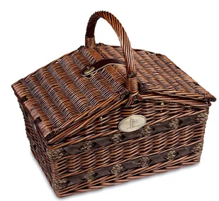 Ręcznie wykonany wiklinowy kosz piknikowy Cilio z wyposażeniem dla czterech osób. Naczynia są zabezpieczone skórzanymi paskami, dzięki czemu wszystkie elementy w trakcie przenoszenia pozostaną na swoim miejscu.