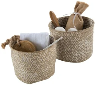 Można stosować je w szufladach, szafach, spiżarniach, na półkach, itp. Konstrukcja metalowa jest ręcznie oplatana włóknem naturalnym. Delikatna zmiana koloru i kształtu jest charakterystyczna, każdy koszyk jest unikatowy. Komplet zawiera 2 rozmiary koszyków okrągłych. Materiał: włókno naturalne.