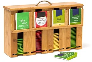 Tutaj funkcjonalność spotyka się z estetyką. Lekko błyszczące, naturalnie usłojone bambusowe pudełko na herbatę ma nie tylko aspekt funkcjonalny. Ciepły kolor drewna zapewnia stylową prezentację torebek z herbatą. Ten praktyczny dozownik torebek herbaty różni się od konwencjonalnego pudełka na herbatę tym, że torebki herbaty można łatwo wyjąć. 4 przegródki oferują wystarczająco dużo miejsca na około 160 torebek herbaty owocowej, miętowej i innych, a rodzaje przechowywanej herbaty można oznaczyć, wkładając torebki do ramek.