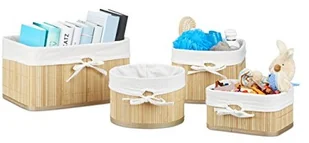 Pojemniki pasują do każdego pomieszczenia i na każdą półkę. Przechowuj zabawki, przedmioty łazienkowe lub ubrania, takie jak skarpetki i bielizna, w sposób oszczędzający miejsce. Zestaw koszy do przechowywania w szczegółach - Materiały: bambus, płyta MDF - Pokrowiec z tkaniny poliestrowej, zdejmowany i nadający się do prania - Kolor: naturalny - Zestaw 4 koszyków Rozmiar i kształt koszyków - Duży prostokątny kosz wys.