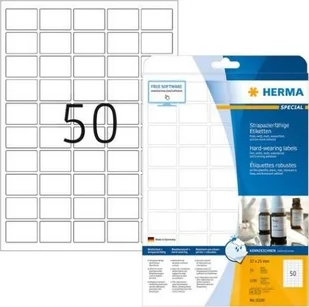 HERMA 8338 Etykiety wytrzymałe A4 37x25 mm białe mocna folia samoprzylepna matowa odporna na warunki atmosferyczne 1250 szt. Białe, matowe etykiety foliowe na arkuszach A4, samoprzylepne. Wytrzymała powierzchnia odporna na warunki atmosferyczne, szczególnie silna przyczepność, odporność na promieniowanie UV i starzenie, odporność na olej i brud, zmywalność, odporność na temperaturę od -30 do +80 °C, odporność na wodę morską. Bezproblemowa obróbka dzięki bezpiecznej krawędzi dookoła i optymalnej płaskości. Do drukarek i kopiarek laserowych, kolorowych drukarek laserowych i kolorowych kopiarek.