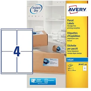 Avery J8169-100 etykiet na paczki, 139 x 99,1 mm, trwałe, 4 etykiety na arkusz, 400 etykiet w opakowaniu