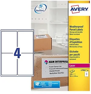 Avery L7994-25 odporne na warunki atmosferyczne etykiety wysyłkowe (4 sztuki na arkusz, 99,1 x 139 mm) 100 etykiet