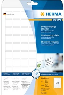 1750 etykietDystrybuując 70 sztuk na arkusz, otrzymujesz łącznie 1750 etykiet. Wymiary: 24,0 x 24,0 mm (szer. x wys.). Umożliwia drukowanie etykiet internetowychAby zapewnić elastyczność użytkowania i zawsze mieć dostępną odpowiednią kopię, 1750 etykiet HERMA z folii odpornej na warunki atmosferyczne 8339 white 24,0 x 24,0 mm można zadrukować. W tym celu można użyć następujących urządzeń: kopiarka, laser czarno-biały, laser kolorowy.