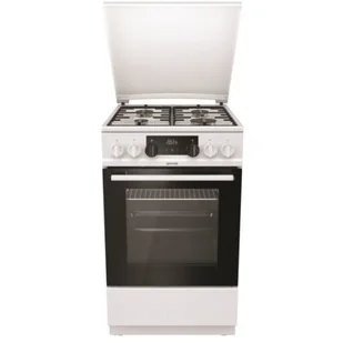 Wolnostojąca kuchnia gazowo-elektryczna GORENJE K5341WH w kolorze białym. Wymiary urządzenia (sz x w x g): 50 × 85 × 59,4 cm. 4 gazowe pola grzewcze: 1 mały palnik (1000 W), 1 duży palnik (3000 W) i 2 palniki standardowe (2 x 1900 W).