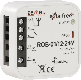NazwaRADIOWY ODBIORNIK BRAMOWYSymbolROB-01/12-24VOpisRadiowy odbiornik bramowy ROB-01/12-24V to uniwersalny (dowolny producent bramy) sterownik pracy bram garażowych i podobnych napędów, umożliwiający sterowanie jej pracą za pomocą nadajników EXTA FREE. Dodatkową korzyścią jest możliwość wspólnego sterowania - jednym pilotem - bramą wjazdową, garażową, oświetleniem pomieszczenia itp.Cechy funkcjonalne produktu: współpraca z nadajnikami bezprzewodowego systemu sterowania EXTA FREE (max 32 nadajniki) sterowanie pracą bram wjazdowych, bram garażowych, innych podobnych napędów możliwość zastosowania 1 pilota do kilku różnych napędów (wjazd na posesję, garaż), w których zainstalowane jest urządzenie ROB-01/12-24V łatwy montaż w puszce podtynkowej fi60 mm duży zasięg działania (do 250m) sygnalizacja optyczna działania niski pobór mocy, możliwość pracy ciągłej możliwość zwiększenia zasięgu działania poprzez zastosowanie retransmitera RTN-01UWAGA! Podany zasięg działania dotyczy przestrzeni otwartej, czyli warunków idealnych, bez przeszkód. Jeżeli pomiędzy nadajnikiem a odbiornikiem znajdują się przeszkody, należy przewidzieć zmniejszenie zasięgu działania odpowiednio dla: cegła od 10 do 40%, drewna i gipsu od 5 do 20%, betonu zbrojonego od 40 do 80%, metalu od 90 do 100%, szkła od 10 do 20%. Negatywny wpływ na zasięg działania mają też napowietrzne i podziemne linie energetyczne dużej mocy oraz nadajniki telefonii komórkowej umieszczone w bliskiej odległości urządzeń.DANE HANDLOWE (ROB-01/12-24V) Opakowanie zbiorcze 10 [szt.]DANE TECHNICZNE (ROB-01/12-24V) Znamionowe napięcie zasilania odbiornika 12 ÷ 24 V AC/DCCzęstotliwość 868 MHzKodowanie transmisja z adresacjąIlość kanałów odbiornika 1Zasięg działania odbiornika 250 mStopień ochrony odbiornika IP20Maksymalny prąd przekaźnika 2 AMaksymalne napięcie przekaźnika 250 V ACMaksymalna moc przekaźnika 500 VAKategoria użytkowania AC3Styki 1 NO