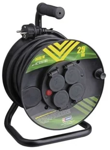 Przedłużacz zwijany 4G/ GUMOWY/ 3x1,5 P084251 - 4 gniazda 25 metrów Solidny przedłużacz bębnowy, który ułatwia rozwijanie i zwijanie przewodu z nawijakiem z gumy. Konstrukcja bębna zapobiega brudzeniu oraz niszczeniu się kabla. Przedłużacz posiada cztery gniazda z uziemieniem oraz zabezpieczenie termiczne. Korpus zakończony ergonomiczną metalową rękojeścią wraz ze stabilną podstawą, zapewnia wygodny i łatwy transport. Dzięki zastosowaniu grubego kabla, nie nagrzewa się i nie ma spadków napięcia, co z kolei korzystnie wpływa na podłączone urządzenia. Materiał wykonania kabla PVC, zapewnia elastyczność nawet w temperaturach ujemnych. Sprawdzi się przy remontach, w budownictwie, w magazynach, stolarniach, warsztatach, na działce oraz przy pracach w domu i wielu innych miejscach.