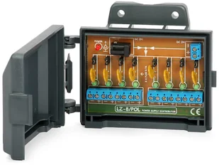 LZ-8/POL to prosty rozgałęźnik zasilania umożliwiający zasilanie kilku urządzeń z jednego zasilacza większej mocy. Łączówka rozgałęzia zasilanie na 8 wyjść, z których każde zabezpieczone jest bezpiecznikiem polimerowym i posiada diodę LED informującą o jego zadziałaniu (brak świecenia oznacza "przepalenie" bezpiecznika).