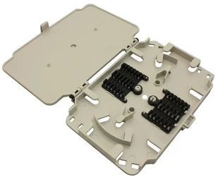 Biała tacka na 12 spawów światłowodowych. Otwór w środku umożliwia montaż na śrubie. Po zdjęciu z zawiasów pokrywki, można umieszczać tacki jedna na drugiej. Tacka posiada pokrywę. Wymiary (długość × szerokość × wysokość): 142 ×
