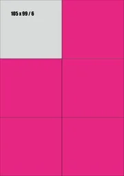 ICPC A4 RÓŻOWE FLUO Etykiety samoprzylepne 105x99 RÓŻOWE FLUO Format: A4 Ilość: 100 arkuszy 6 naklejek na arkuszu Informacje dodatkowe: Nadają się do wszystkich urządzeń drukujących - drukarek atramentowych, drukarek laserowych, kopiarek. Podłoże papierowe, matowe. Kolor różowy fluo (023) - w rzeczywistości kolor etykiet może nieznacznie różnić się od koloru w ofercie.