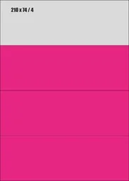 ICPC A4 RÓŻOWE FLUO Etykiety samoprzylepne 210x74 RÓŻOWE FLUO Format: A4 Ilość: 100 arkuszy 4 naklejki na arkuszu Informacje dodatkowe: Nadają się do wszystkich urządzeń drukujących - drukarek atramentowych, drukarek laserowych, kopiarek. Podłoże papierowe, matowe. Kolor różowy fluo (023) - w rzeczywistości kolor etykiet może nieznacznie różnić się od koloru w ofercie.
