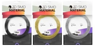 filament pla marki 3dsimo o średnicy 1.75 mm, w trzech szpulach po 5 m (łącznie 15 m) w kolorach: czarnym, złotym i szarym. wytwarzany z naturalnych surowców tj. buraków cukrowych lub kukurydzy.