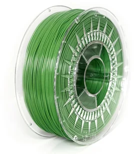 Filament marki Devil Design w kolorze zielonym. Materiał filamentu jest termoplastycznym poliestrem w postaci włókna (PLA). Średnica filamentu wynosi 1,75 mm. Optymalna temperatura drukowania znajduje się między 200°C a 235°C. Może być stosowany do druku 3D we wszystkich drukarkach metodą FFF.