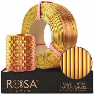 Bezszpulowy filament PLA Magic Silk firmy Rosa3D to materiał o niestandardowym wyglądzie służący jako wkład do drukarek 3D oraz piór drukujących. Jest on połączeniem kilku kolorów, które płynnie rozciągają się na wydruku. Kolor Gold-Copper łączy ze sobą barwę złotą oraz miedzianą. Masa filamentu Refill wynosi 1 kg, a jego średnica jest równa 1,75 mm.