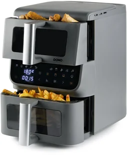 DOMO DO550FR frytkownica na gorące powietrze, 2 komory, pionowa, 10 l, innowacyjna prędkość powietrza, oszczędność 30% miejsca, wyświetlacz dotykowy LED z okienkiem, 2500 W, szara