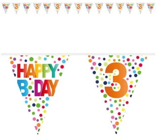 Baner na 3 urodziny. Flagi z nadrukowanymi kolorowymi kropkami i cyfrą 3 oraz kolorowym napisem HAPPY BDAY. W sumie w zestawie jest 15 flag połączonych tasiemką o łącznej długości 1000centymetrów = 10 m.