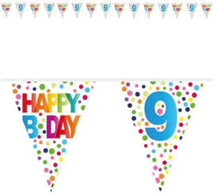 Baner na 9 urodziny. Flagi z nadrukowanymi kolorowymi kropkami i cyfrą 9 oraz kolorowym napisem HAPPY BDAY. W sumie w zestawie jest 15 flag połączonych tasiemką o łącznej długości 1000centymetrów = 10 m.