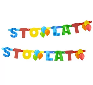 Girlanda "STO LAT STO LAT" o łącznej długości ~150 cm. Napis składa się z wyrazów STO LAT STO LAT oddzielonych os siebie balonikami. Girlanda wykonana z papieru, literki łączone ze sobą metalowymi nitami. Na początku i na końcu sznureczki do łatwego przywiązania.
