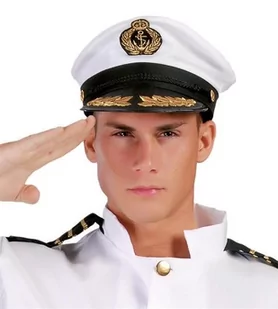 Biała marynarska CZAPKA MARYNARZA / KAPITANA z usztywnionym czarnym daszkiem, złotymi gałązkami, czarnym paskiem oraz złotą MARYNARSKĄ aplikacją to idealny element przebrania dla MARYNARZA / KAPITANA lub PANI KAPITAN statku. Produkt dedykowany dla dorosłych.