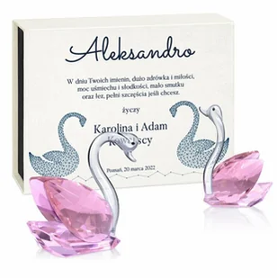 Wspaniałe, kryształowe łabędzie dedykowane dla niej na imieniny i zapakowane w eleganckie pudełko zdobione spersonalizowanym nadrukiem.