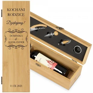 Akcesoria do wina zestaw w skrzynce z nadrukiem dla rodziców jako podziękowanien ślubne