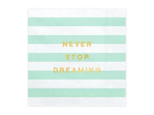 Eleganckie, piękne SERWETKI typu lunch w białym kolorze, zdobione miętowymi paskami. Produkt z kolekcji YUMMY. Idealnie sprawdzą się podczas każdej okazji, dodatkowo zdobione są złotym metalicznym napisem NEVER STOP DREAMING! W zestawie znajduje się 20 serwetek.