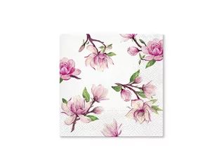 Świetne serwetki papierowe z kolekcji Rosy Style. Serwetki w kolorze białym z nadrukiem RÓŻOWYCH MAGNOLI. Serwetki idealnie będą pasować na niedzielny obiad, urodziny lub chrzciny. Świetny zestaw, który wzbogaci Twoją dekorację. Zestaw zawiera 20 serwetek typu lunch.