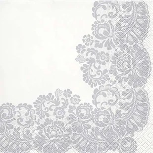 Świetne serwetki papierowe z kolekcji Lacy Frame. Serwetki w kolorze białym z nadrukiem SREBRNEJ KORONKOWEJ RAMKI. Serwetki idealnie będą pasować na niedzielny obiad, urodziny lub garden party. Świetny zestaw, który wzbogaci Twoją dekorację. Zestaw zawiera 20 serwetek typu lunch.