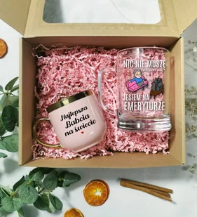 Zestaw Prezentowy dla Babci i Dziadka Podaruj Babci i Dziadkowi wyjątkowy prezent, który wyrazi Twoją miłość i wdzięczność! Zestaw zawiera: Kubek dla Babci z napisem „Najlepsza Babcia na Świecie” – subtelny, praktyczny i pełen uroku, idealny na ulubioną kawę lub herbatę. Kufel dla Dziadka z humorystycznym napisem „Nic nie muszę, jestem na emeryturze” – doskonały wybór na relaksujące chwile z ulubionym napojem. Stylowe pudełko z okienkiem, które nadaje zestawowi elegancji i czyni go gotowym do wręczenia. Wewnątrz znajduje się ozdobny wypełniacz, dodający wyjątkowego charakteru.