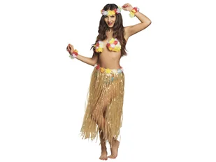 Hawajski zestaw w wersji PARADISE w klasycznej kolorystyce będzie stanowił idealny element egzotycznego przebrania na HAWAJSKIE PARTY. W zestawie znajduje się spódnica wykonana z lekkiej raffi z dołączonym kwiecistym pasem, opaska na głowę, bransoletki oraz biustonosz.
