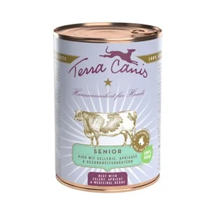 Ponieważ trawienie zbóż i pseudozbóż staje się bardzo trudne dla coraz wolniej pracującego przewodu pokarmowego starzejącego się psa, wszystkie dania dla seniorów nie zawierają zbóż. Aby nie obciążać wolniej pracującego przewodu pokarmowego starzejących się psów, jako dodatek zastosowano ziemniaki, warzywa i owoce, które jednocześnie również pokrywają zapotrzebowanie na witaminy i minerały. Zapotrzebowanie na minerały dopełnia pyłek kwiatowy, algi morskie, gleba mineralna, organiczna skorupa jaja w proszku i mąka kokosowa. Dania dla seniorów Terra Canis mają również niższą całkowitą ilość kalorii niż dania dla dorosłych psów, ponieważ psi seniorzy zazwyczaj mają nieco niższe zapotrzebowanie na kalorie i energię. Najczęstsze dolegliwości psa wynikające z podeszłego wieku są związane z sercem, stawami, nerkami i pęcherzem oraz układem odpornościowym.