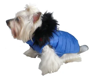 Zapinana na napy na klatce piersiowej, co ułatwia zakładanie ubranka. Brak rękawów, które mogłyby krępować i utrudniać poruszanie się pieska. Kaptur jest obszyty wysokiej jakości efektownym futerkiem z długim włosem w kolorze czarnym. Zapięcia na zatrzaski umożliwiają wersję kurteczki z kapturem i bez. Ubranka są ręcznie robione w Polsce.