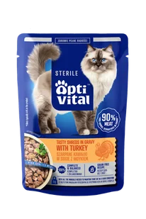 OptiVital Sterile zawiera aż 90% mięsa i produktów pochodzenia zwierzęcego w kawałku. Soczysty indyk w sosie to smak, któremu mało który kot potrafi się oprzeć.