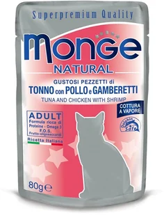 Karma stworzona z myślą o naturalnym karmieniu z wykorzystaniem tylko naturalnych, starannie wyselekcjonowanych składników. Stanowi uzupełniający pokarm dla kotów z pysznym tuńczykiem i kurczakiem z dodatkiem krewetek, ze wszystkimi cechami najwyższej jakości produktów: smakowitości płynącej ze świeżych, najwyższej jakości składników o wysokiej wartości odżywczej, bogatych w kwasy Omega 3 i białko oraz niskiej zawartości tłuszczu. Produkt jest całkowicie naturalny, w galarecie, bez barwników i konserwantów oraz glutenu. Doskonale pomagają utrzymać dobrą kondycję, rześkość i energię każdego dnia.
